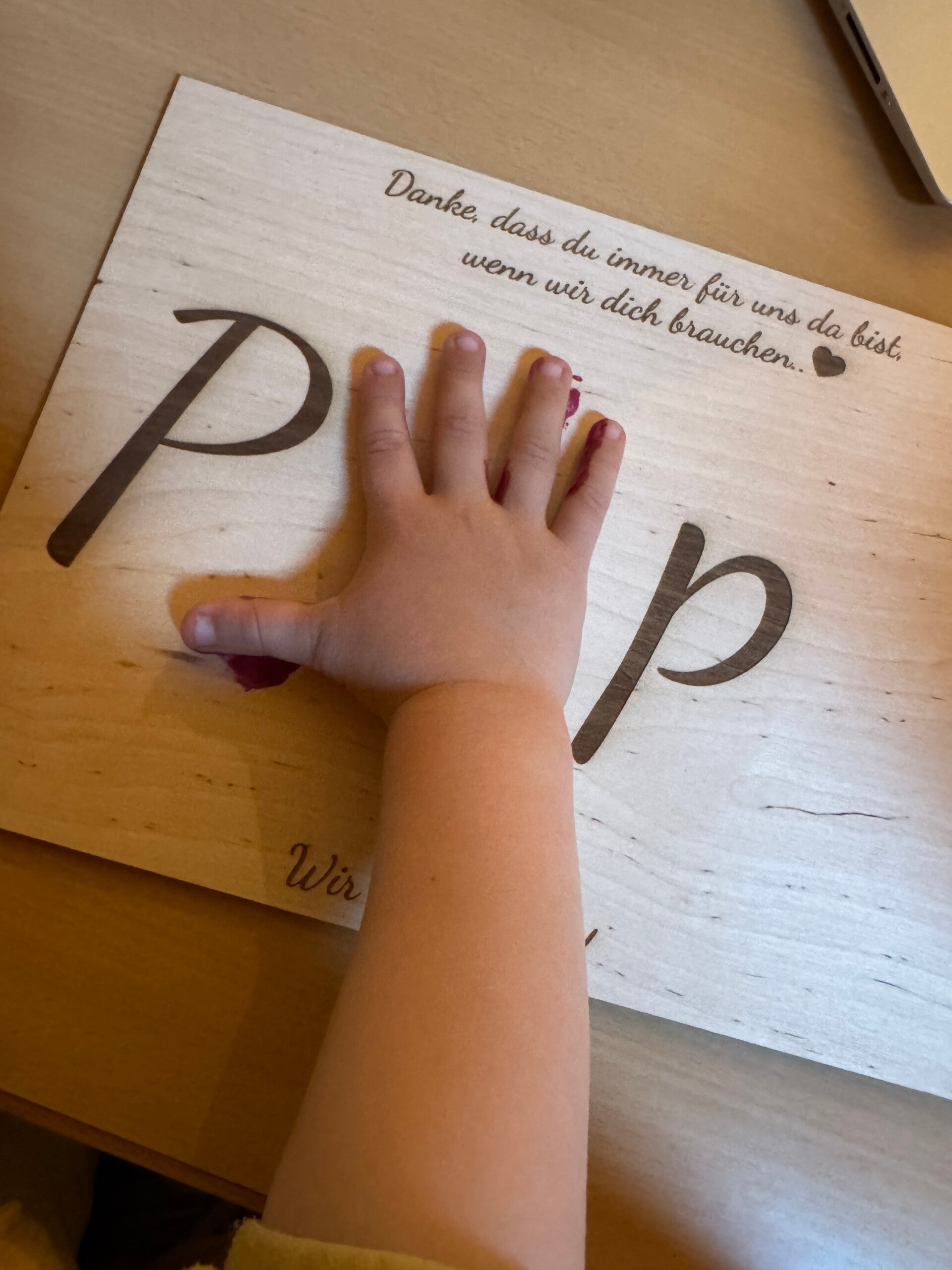 Auf dem Schild steht der gravierte Name Papa mit den Buchstaben P p ,dazwischen können die Kinder ihr Handabdrücke oder Fußabdrücke verewigen. Eine ganz besondere Art, die Entwicklung der Kleinen festzuhalten und Papa eine bleibende Freude zu bereiten.