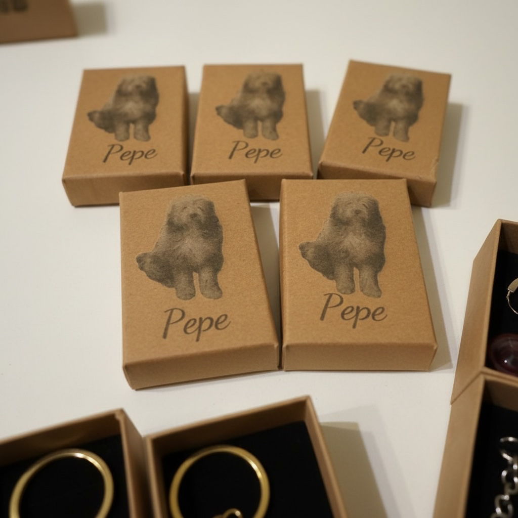 Auf Wunsch ist die Box in dem der Anhänger verpackt wird individuell personalisierbar, z. B. mit Hundepfote, Namen oder Motiv. (siehe letztes Bild)